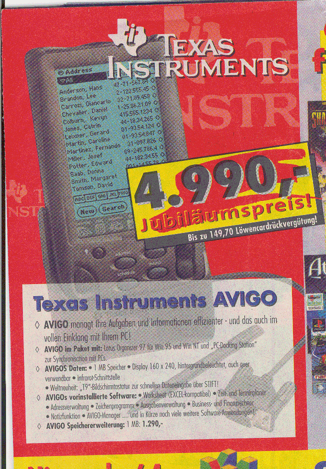 In der Novemberausgabe eines Werbeprospekts der österreichischen Eletronikhandelskette Hartlauer findet sich auch der Texas Instruments Avigo. Der Preis beträgt ÖS 4.990,-. Für die 1 MB Speichererweiterung werden ÖS 1.290,- verlangt.