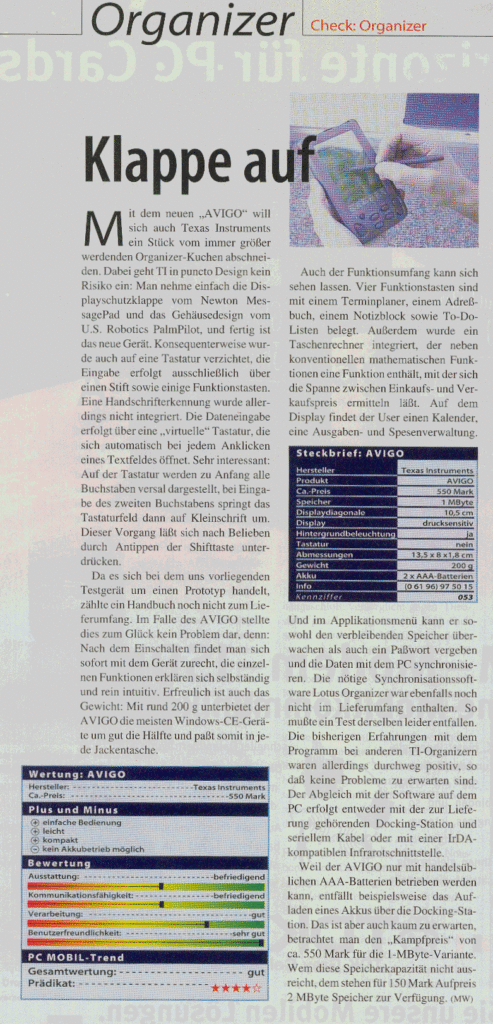 Avigo Artikel in PC Mobil Veröffentlicht am 1. Dezember 1997 In Ausgabe November/Dezember 1997 der Zeitschrift PC Mobil findet sich ein Artikel zum Texas Instruments Avigo. Veröffentlicht in Avigo Avigo Vorheriger Beitrag Avigo in Werbesprospekt von Mediamarkt Nächster Beitrag Avigo im Weihnachtskatalog der Firma Propad