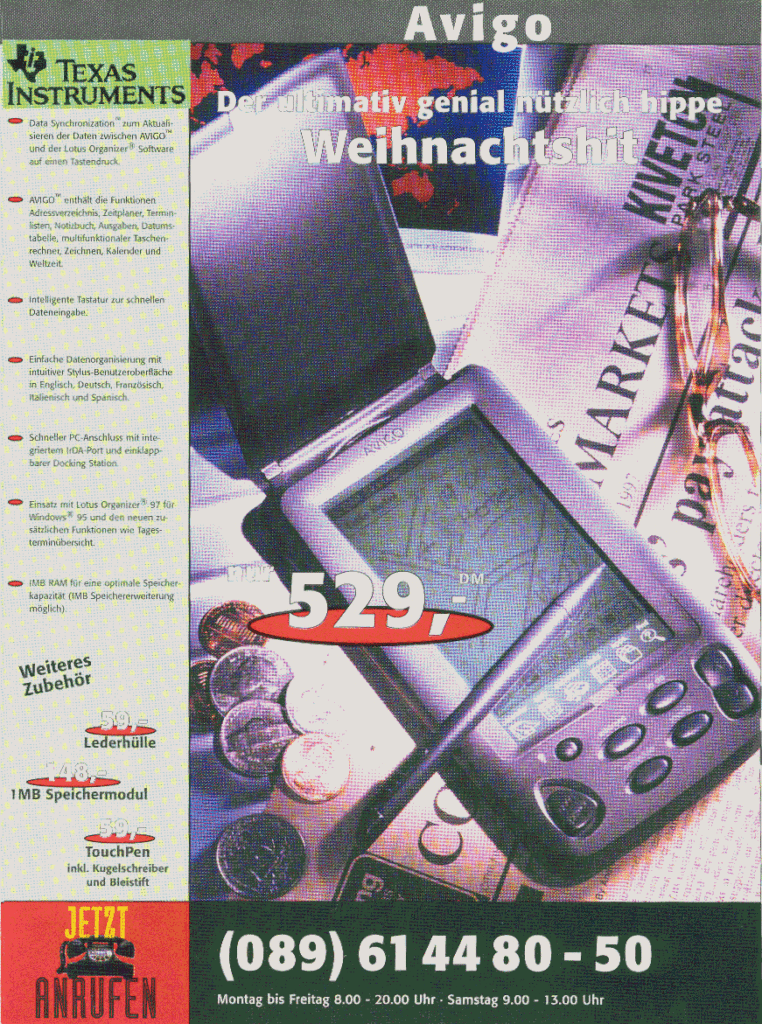 Avigo im Weihnachtskatalog der Firma Propad Veröffentlicht am 1. Dezember 1997 Im Weihnachtskatalog der Firma Propad findet sich auch der Avigo zu einem Preis von DM 529,-. Veröffentlicht in Avigo Avigo Vorheriger Beitrag Avigo Artikel in PC Mobil Nächster Beitrag tExas News vom 1. Dezember 1997