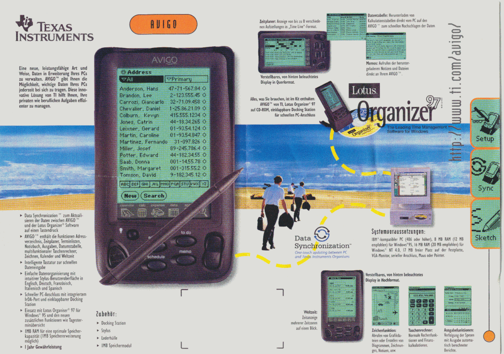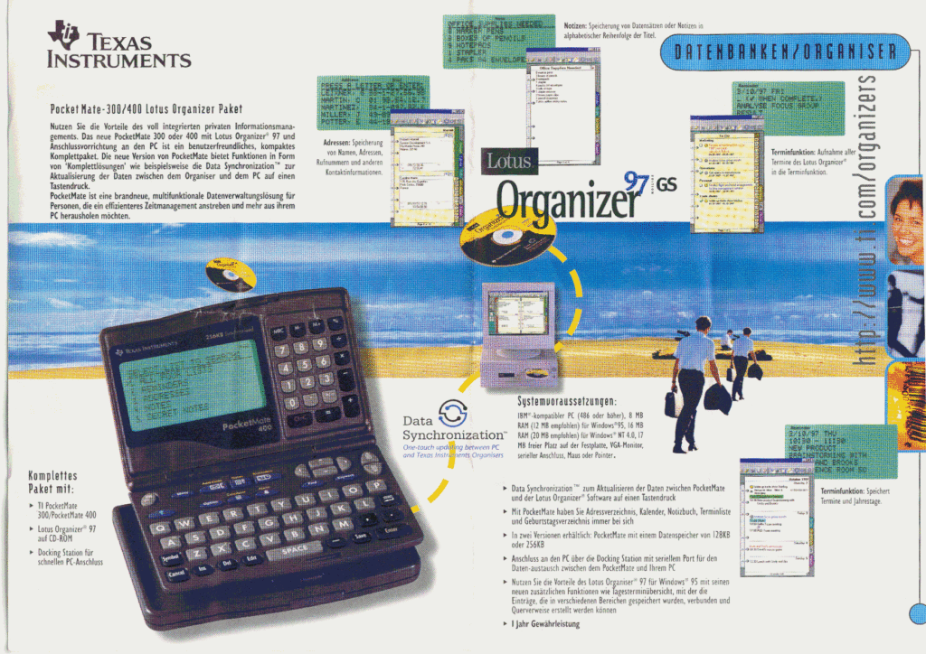 Natürlich möchte ich euch den Folder von Texas Instruments zum Avigo 10 nicht vorenthalten. Auf der zweiten Seite findet sich zwar ein weiteres Produkt, nämlich der TI Pocket Mate, aber auch einige Produktfotos zum PC-Programm Lotus Organizer 97, dem Programm mit dem auch der Kalender, die Aufgaben und die Adrssen des Avigo am PC synchronisiert werden können.