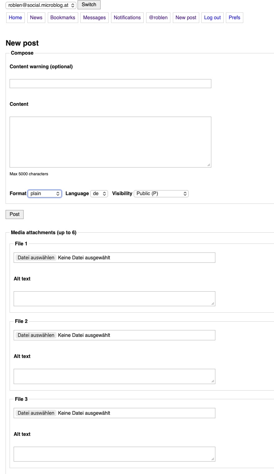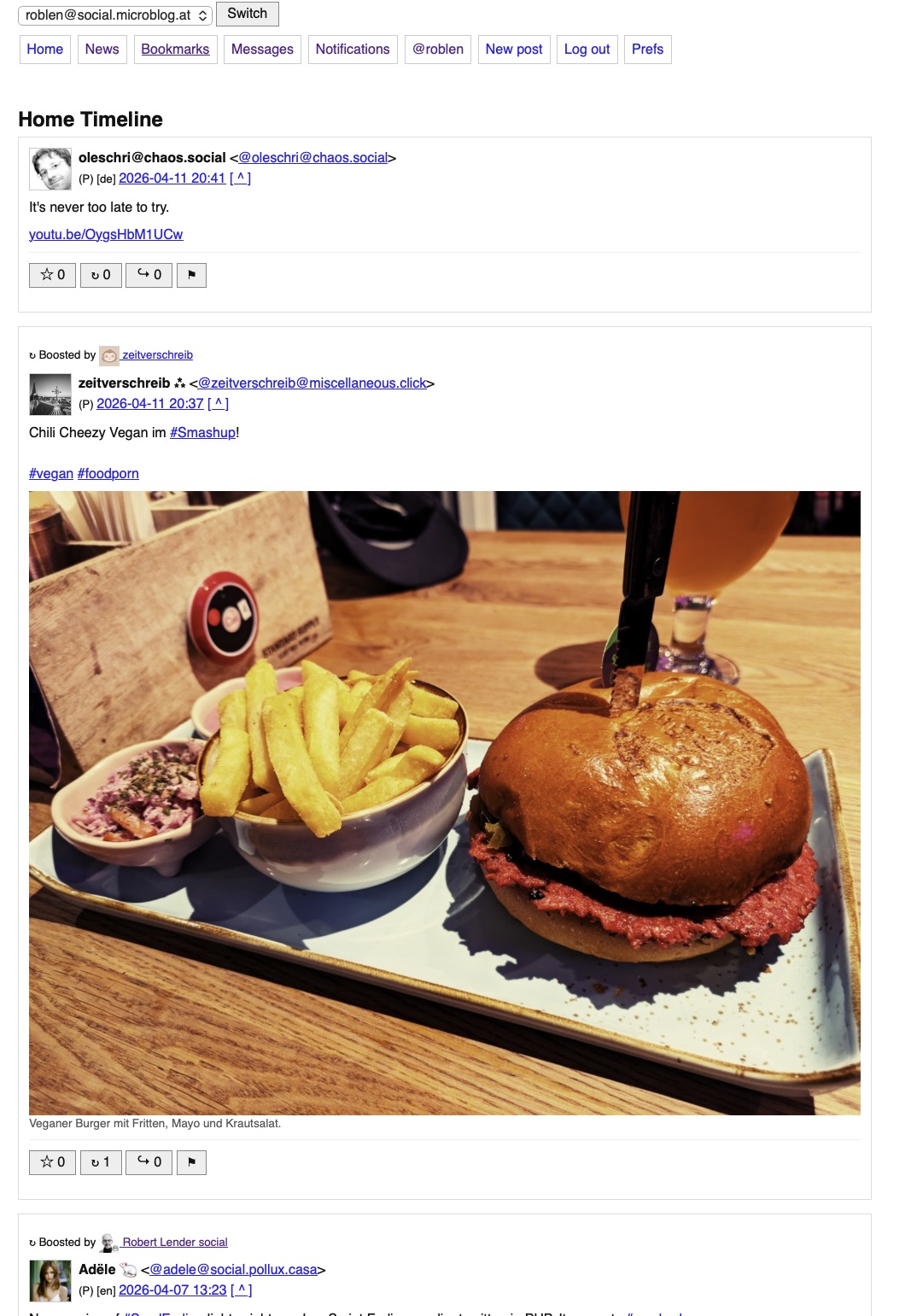 Es ist eine PHP-Anwendung. … Es nutzt eine SQLite-Datenbank und einfache PHP-Sitzungen. Jede Seite wird serverseitig generiert und als reines HTML gesendet. Es unterstützt mehrere Konten, Timelines, Benachrichtigungen, Umfragen, Medienanhänge mit Alt-Text, Inhaltswarnungen, Verfassen, Antworten, Boosten, Favorisieren – alles, was ich tatsächlich täglich nutze. … Es gibt keine einzige Zeile JavaScript im Code.